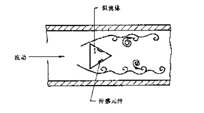渦街流量計(jì)(蒸汽流量計(jì))的基本原理是卡門渦街原理,即“渦街旋渦分離頻率與流速成正比"。變送器流通本體直徑與儀表的公稱口徑基本相同。如圖一所示,流通本體內(nèi)插入有一個(gè)近似為等腰三角形的柱體,柱體的軸線與被測介質(zhì)流動(dòng)方向垂直,底面迎向流體。